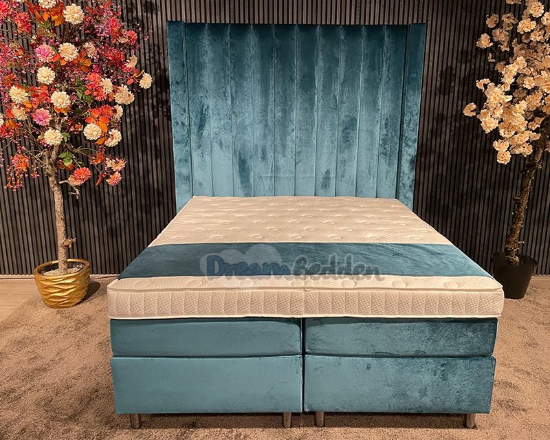 Het hoofdbord met verticale stroken geeft deze boxspring een Chique koninklijke uitstraling!