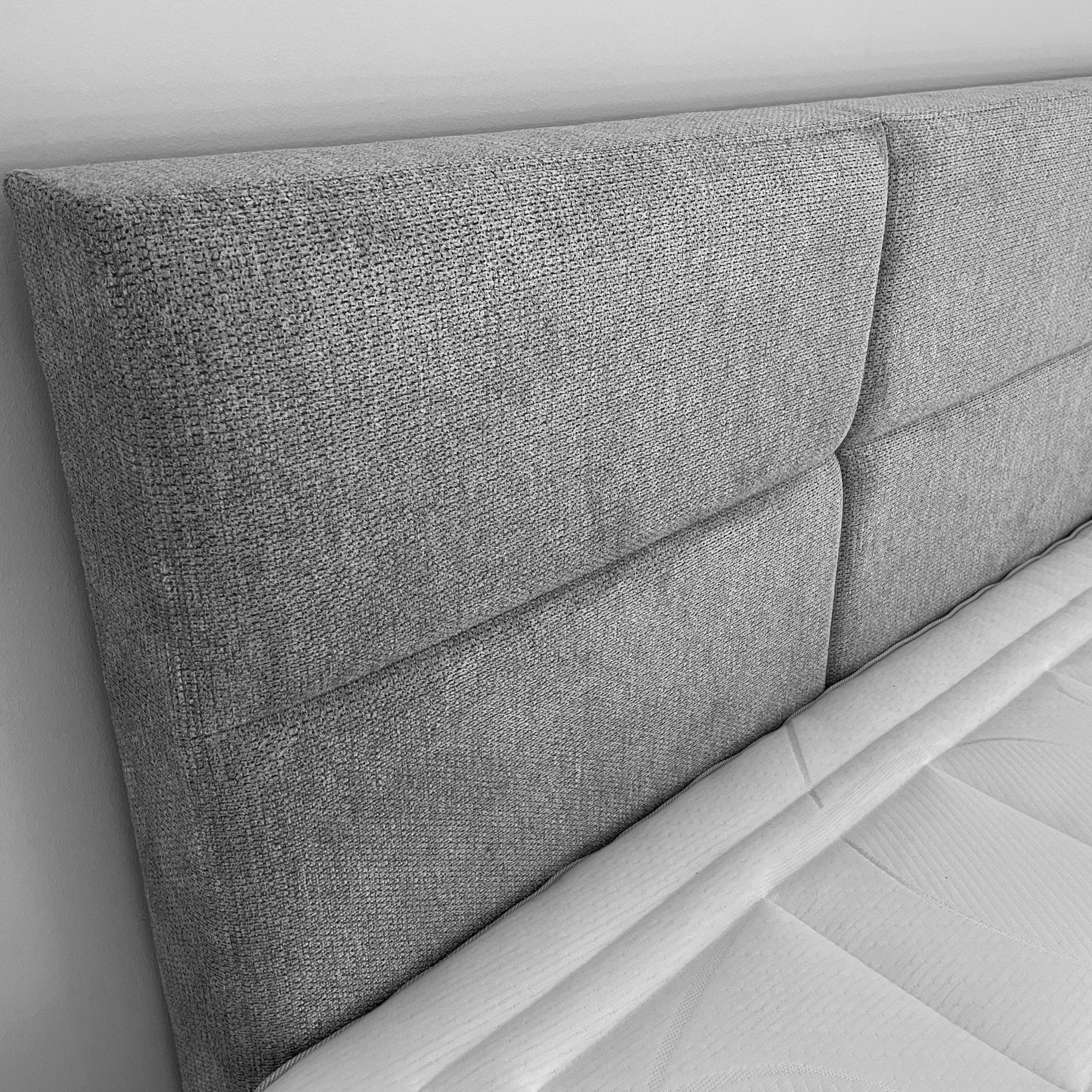 Deze boxspring met achterwand “4000 met blokken” combineert strak design met praktische functionaliteit. De achterwand is perfect afgestemd op de breedtemaat van het bed en loopt gelijk met de onderzijde van de box, wat zorgt voor een rustige, symmetrische uitstraling. De blokstructuur in de achterwand geeft het geheel een moderne en krachtige uitstraling. Met een hoogte van 110 cm en een stevige dikte van 12 cm vormt het een stijlvol en robuust geheel.
