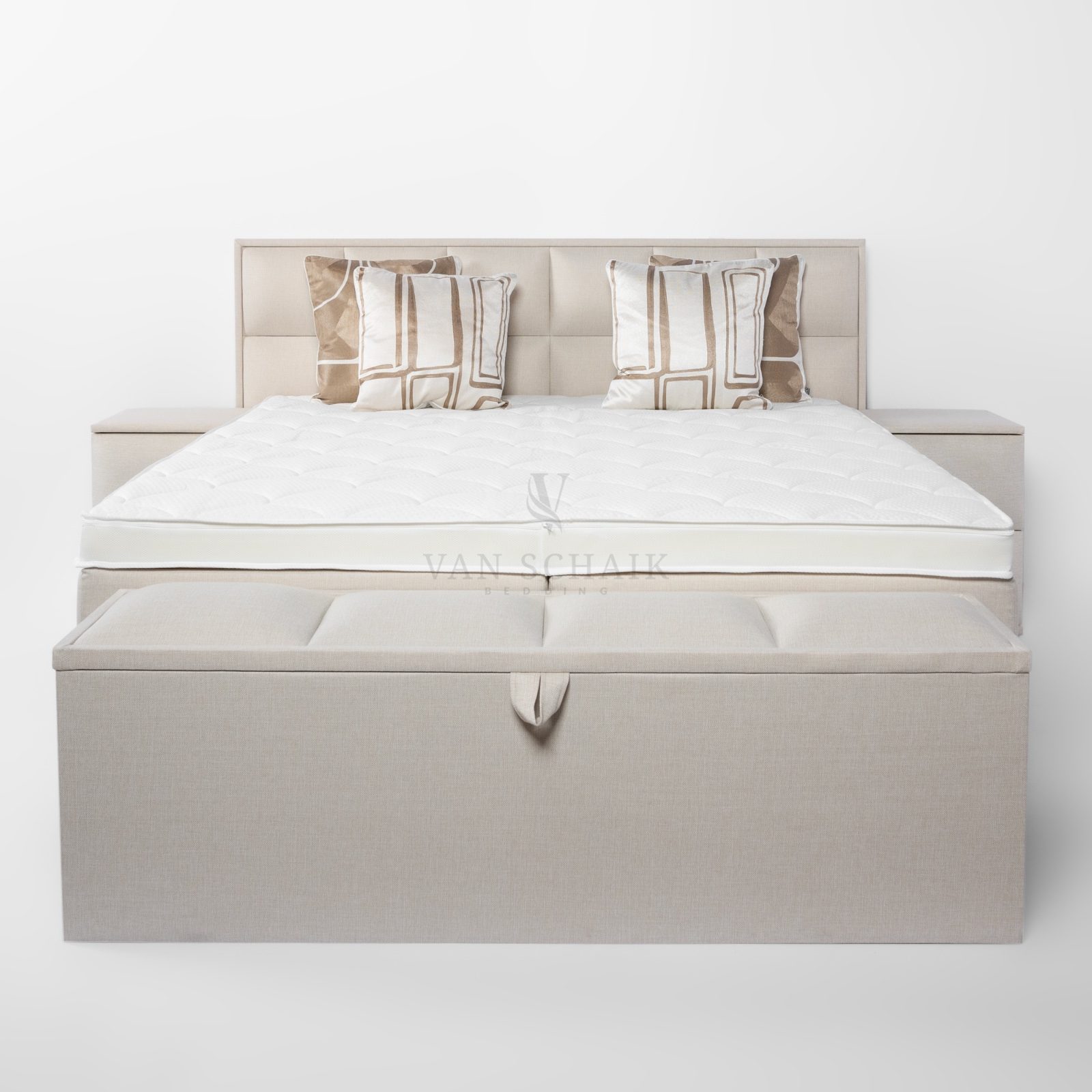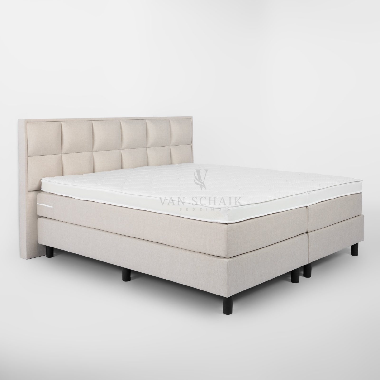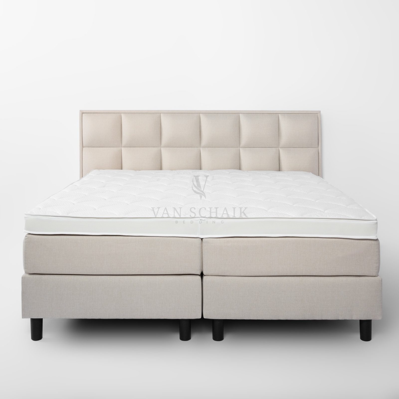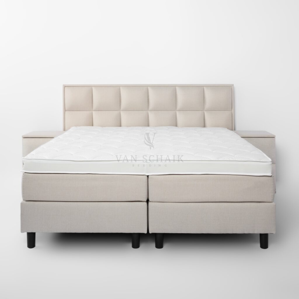 Bovenop de matrassen komt de luxe hotel-topper van circa 10 cm dik, vervaardigd uit stevig koudschuim. Deze topper biedt extra comfort en past zich naadloos aan je lichaam aan. Je kunt ook kiezen uit andere toppers met een dikte van 8 tot 12 cm, in verschillende hardheden – volledig naar jouw wens.