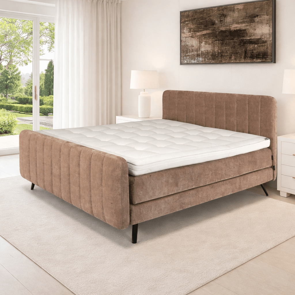De fundering van de Caresse 3460 Vlak bestaat uit een robuust metalen frame met geïntegreerde poten van 19 cm hoog. Dit design zorgt niet alleen voor maximale stabiliteit, maar creëert ook een zeer comfortabele instaphoogte van 59 cm (gemeten exclusief het topmatras). Omdat ieder lichaam uniek is, bieden wij diverse maatwerkopties aan. Zo kunt u kiezen uit drie verschillende matras hardheden: medium, firm en extra-firm. Ook zijn er upgrades mogelijk naar een micro-pocketveer 1000 matras of combispring, en kunt u tegen een meerprijs kiezen voor de extra lengtematen van 210 of 220 cm.