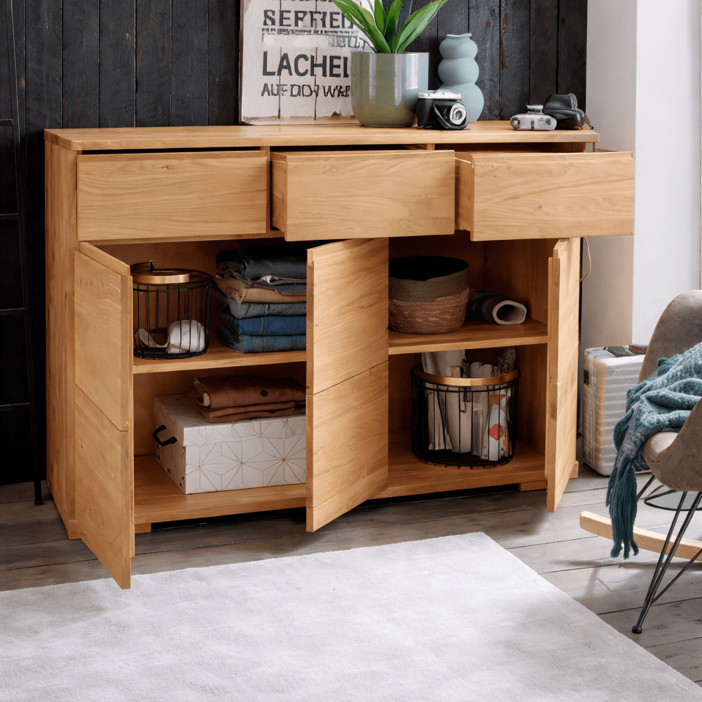 De Forestales Atlanta Commode VII is een indrukwekkend dressoir van 100% massief wild eikenhout. Omdat dit meubel volledig is behandeld met natuurlijke oliën, blijft de authentieke houtstructuur optimaal beschermd en voelbaar. Bovendien biedt de unieke indeling met drie kleine laden en drie deuren een enorme hoeveelheid georganiseerde opbergruimte. Dankzij de moderne handgreepstrips behoudt het ontwerp tevens een strak en tijdloos karakter. Daarom haalt u met dit duurzame vakmanschap direct een warme en luxe sfeer in uw interieur.