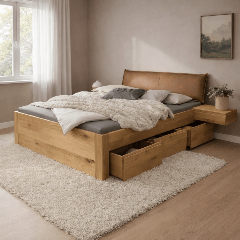 Het Forestales Montreux Massief Houten Ledikant met Lades belichaamt de perfecte synergie tussen robuustheid en verfijnd Duits vakmanschap. Dit bed is namelijk volledig vervaardigd uit massief gevingerlast eikenhout, wat een ongeëvenaarde stabiliteit garandeert. Omdat elk onderdeel in Duitsland met uiterste precisie wordt geproduceerd, bent u bovendien verzekerd van een meubelstuk dat generaties lang meegaat.