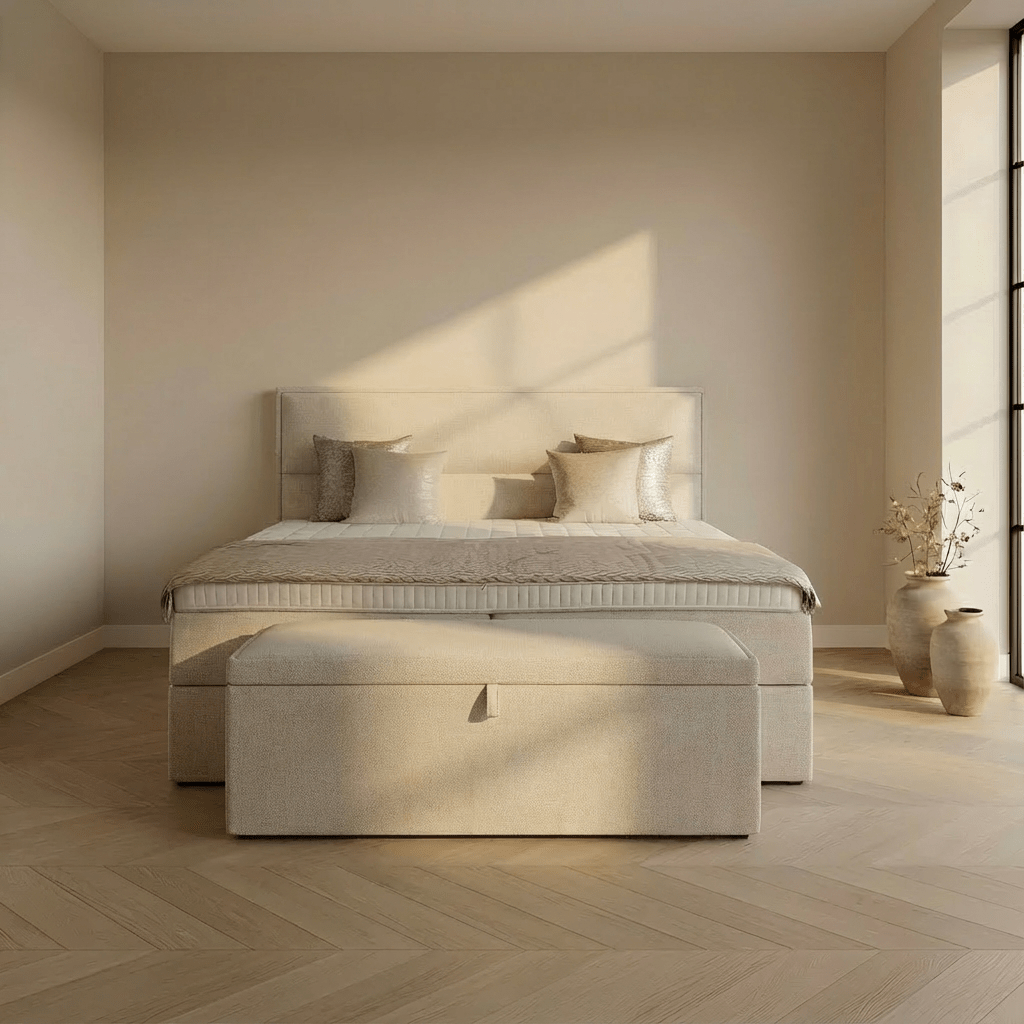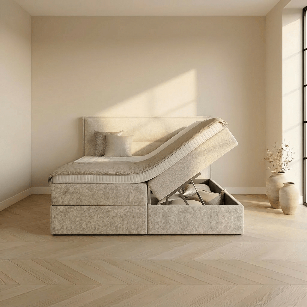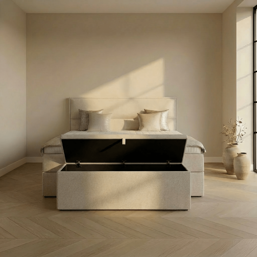 De royale opbergvakken onder de boxspring bieden ruimte voor beddengoed, kussens of seizoenskleding. Zo benut je de ruimte in de slaapkamer maximaal zonder in te leveren op comfort of uitstraling.