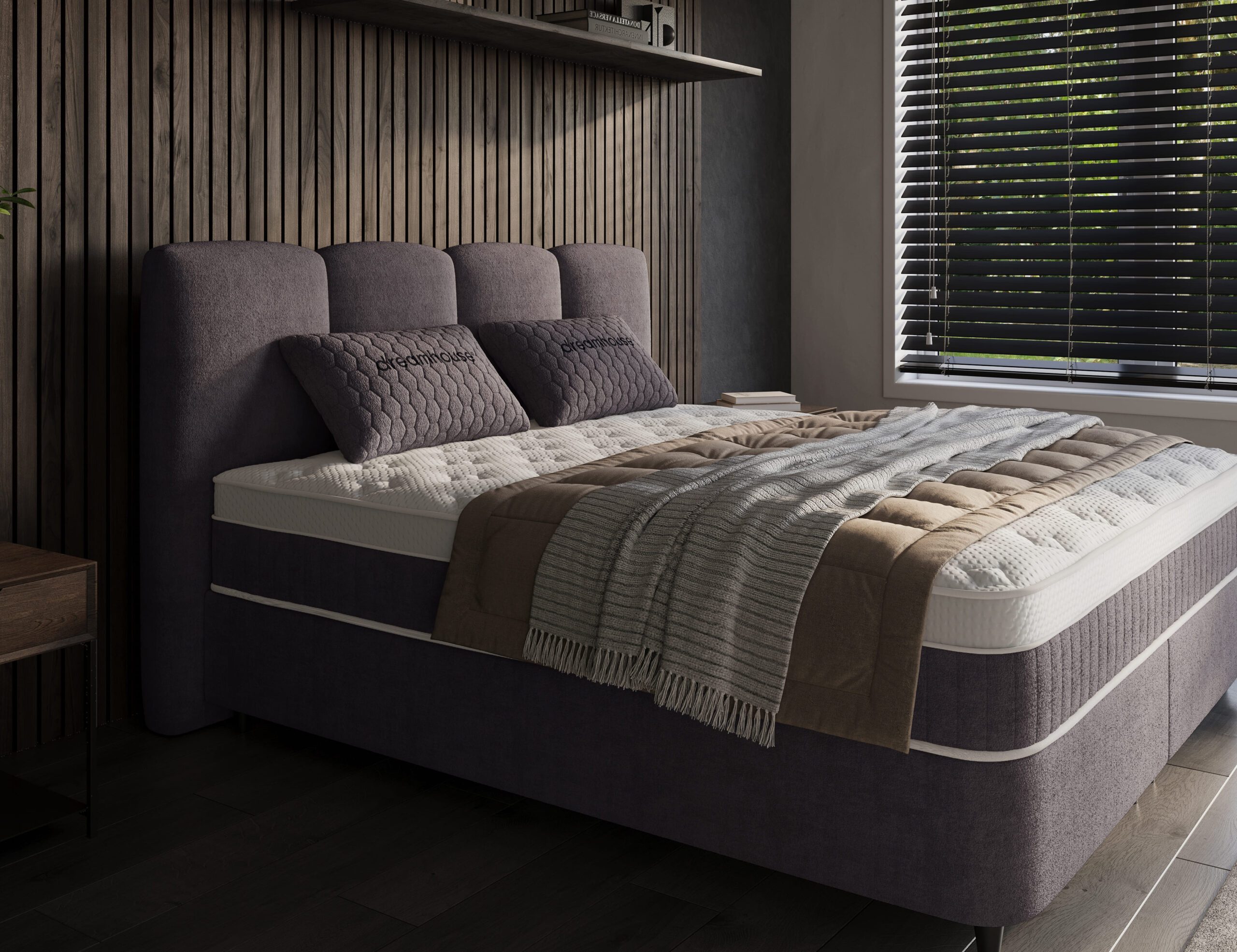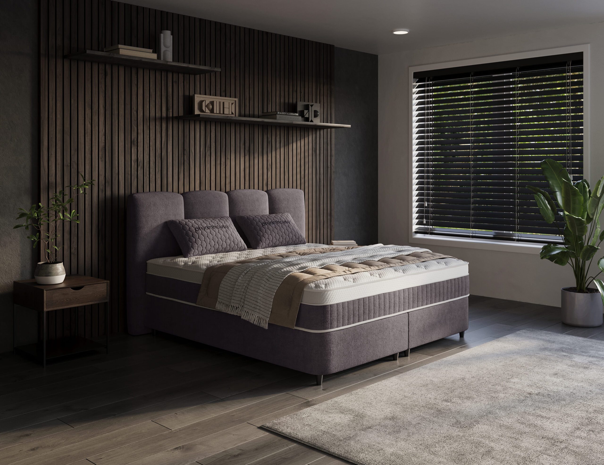 Het hoofdbord is geïnspireerd op de Japanse en Scandinavische minimalistische stijl. De verticale belijning en diepe antracietkleur geven het bed karakter, terwijl het ingetogen ontwerp rust brengt in de ruimte.
