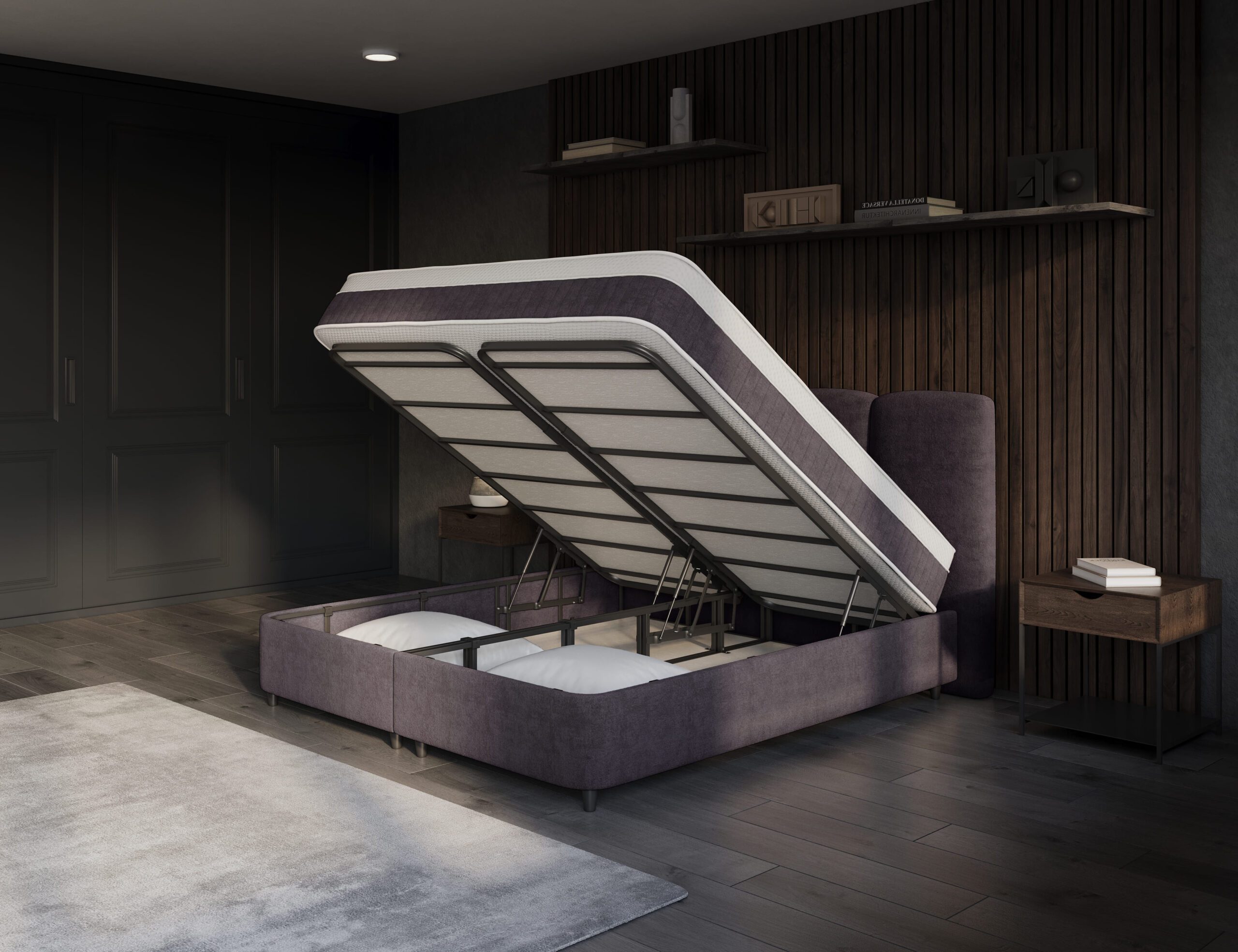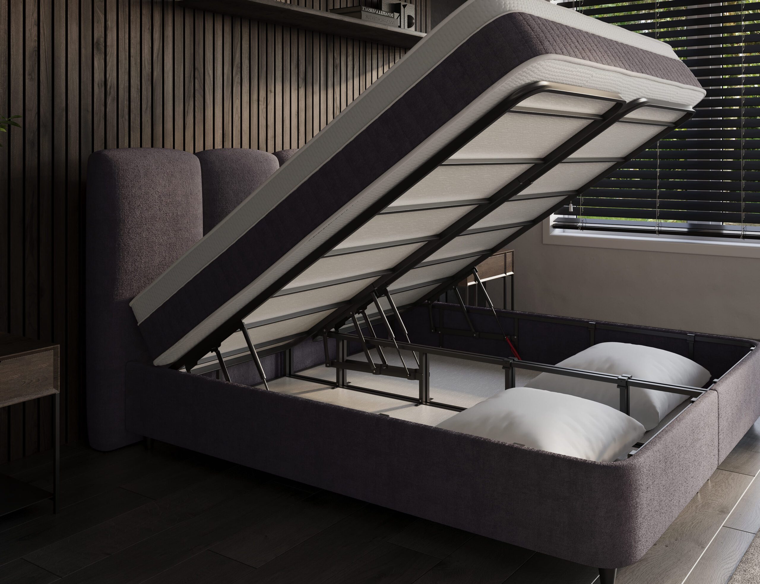 Onder de box bevindt zich een ruime opbergruimte die je eenvoudig opent via de voorkant. Het metalen frame is gelegeerd met carbon en voorzien van vier voorgemonteerde gasveren van 1.000N per stuk. De bodem is afgewerkt met gefineerd plaatmateriaal en beveiligd voor veilig gebruik. De handgrepen aan zowel de box als de matras maken openen extra comfortabel.
