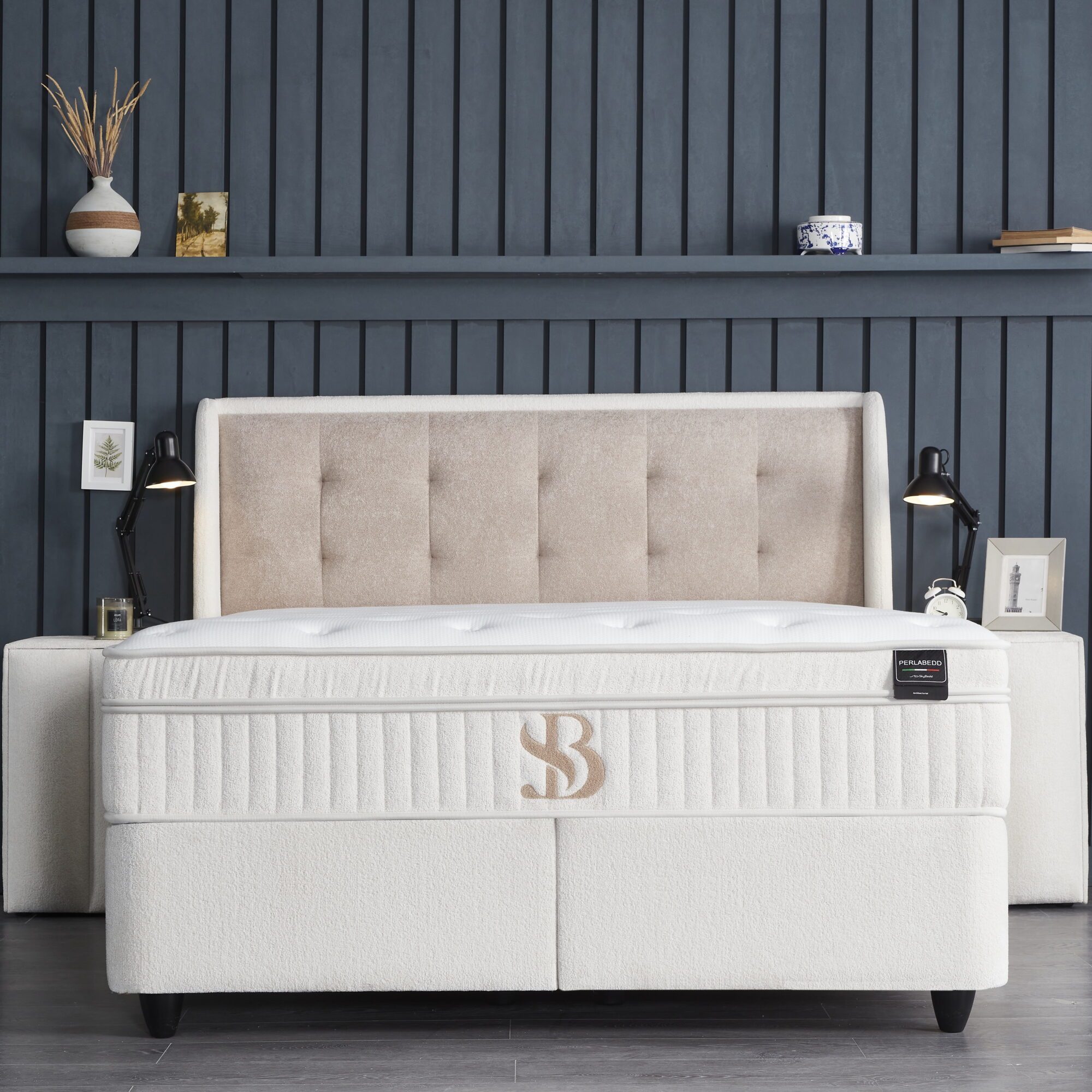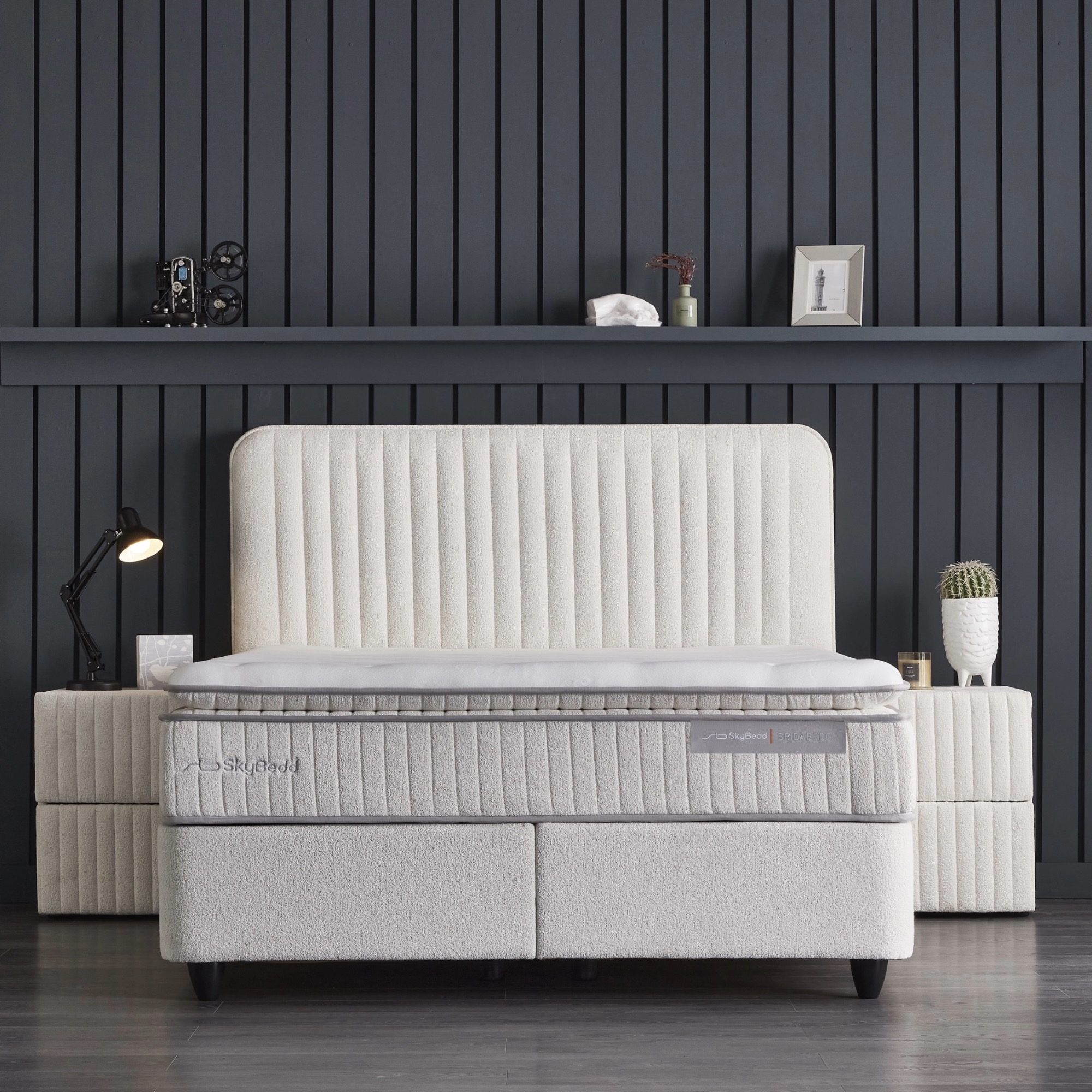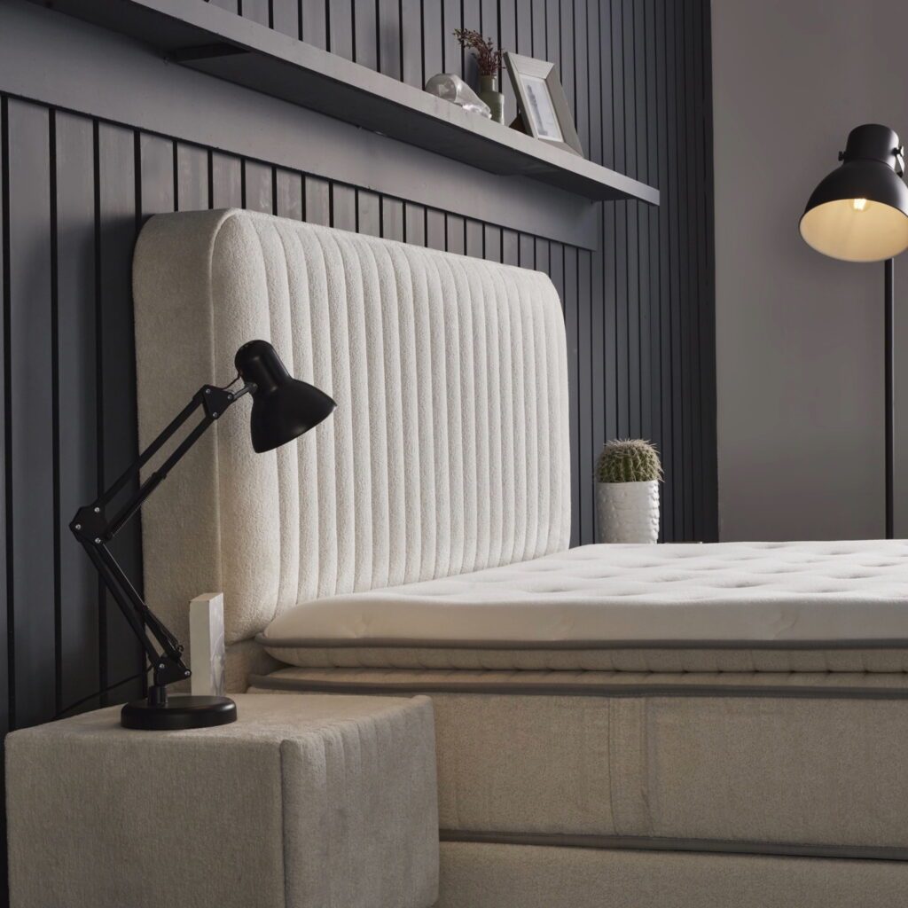De Bridabedd van Skybedd brengt rust, eenvoud en functionaliteit samen in een verfijnd Japandi ontwerp. Het minimalistische hoofdbord met verticale smalle stroken, bekleed in zachte bouclé stof, straalt een moderne maar warme stijl uit. Verkrijgbaar in 90, 140, 160 en 180 cm breedtematen, is deze boxspring geschikt voor zowel compacte als royale slaapkamers.