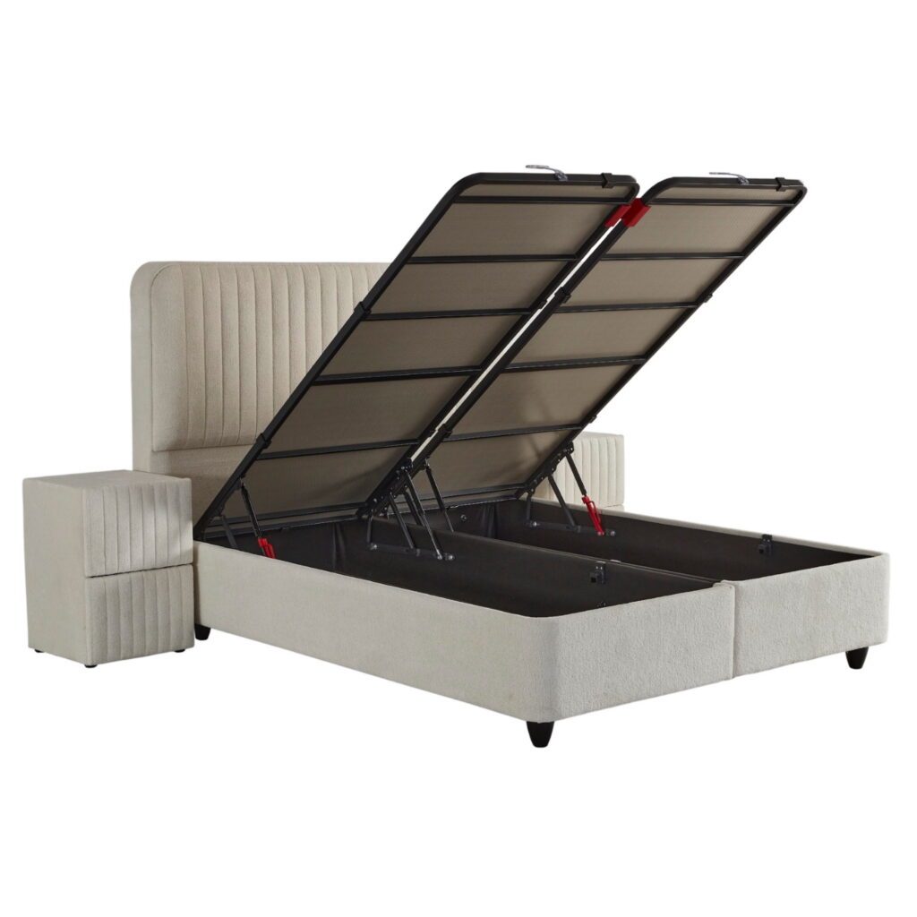 Onder de onderbox bevindt zich een verborgen opbergbox die dankzij de 4 voorgemonteerde gasveren (totaal 9000 newton) moeiteloos opent via de voorkant. Elk formaat biedt een bijpassende opbergruimtecapaciteit: