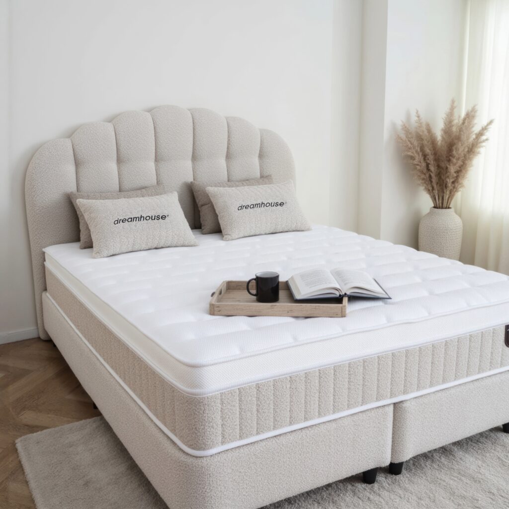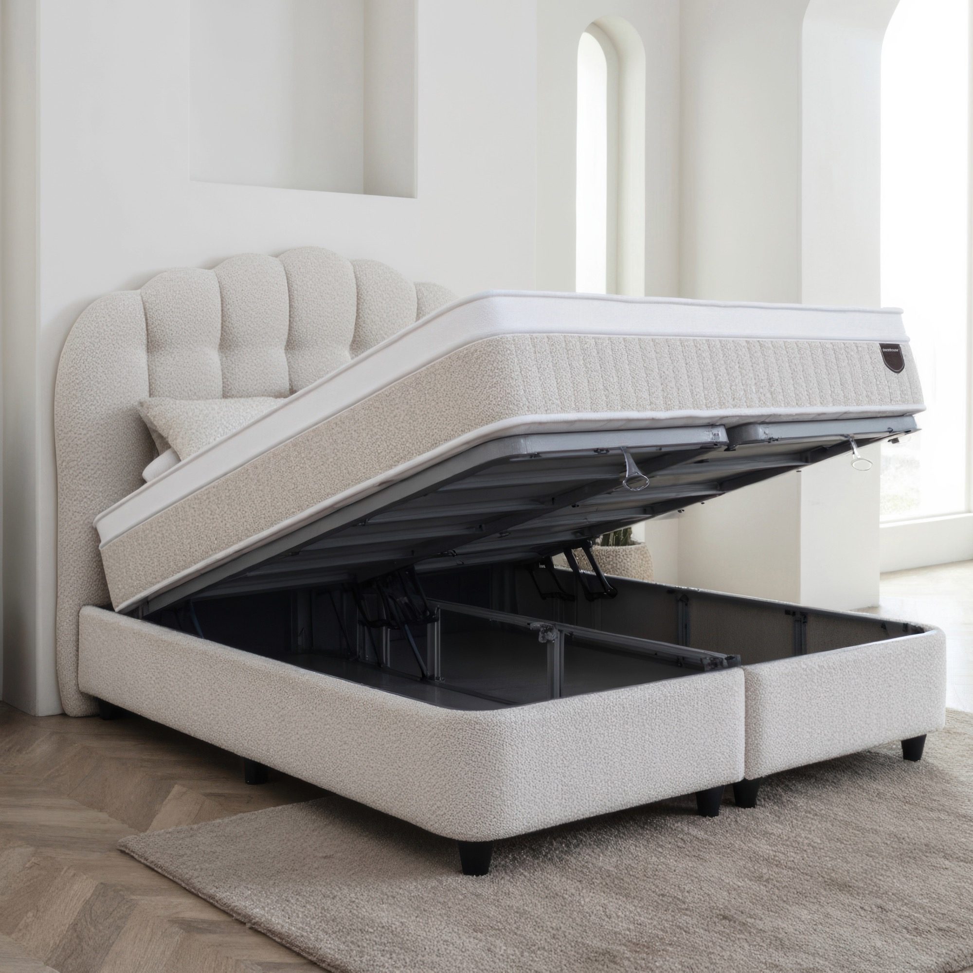 De Dreamhouse Gradia combineert handgemaakt boho-design met het gemak van functionele opbergruimte. Het golvende hoofdbord in zachte teddy bouclé en de royale opslag onder het bed maken van deze boxspring een uniek pronkstuk voor wie houdt van stijl en praktisch comfort in één.