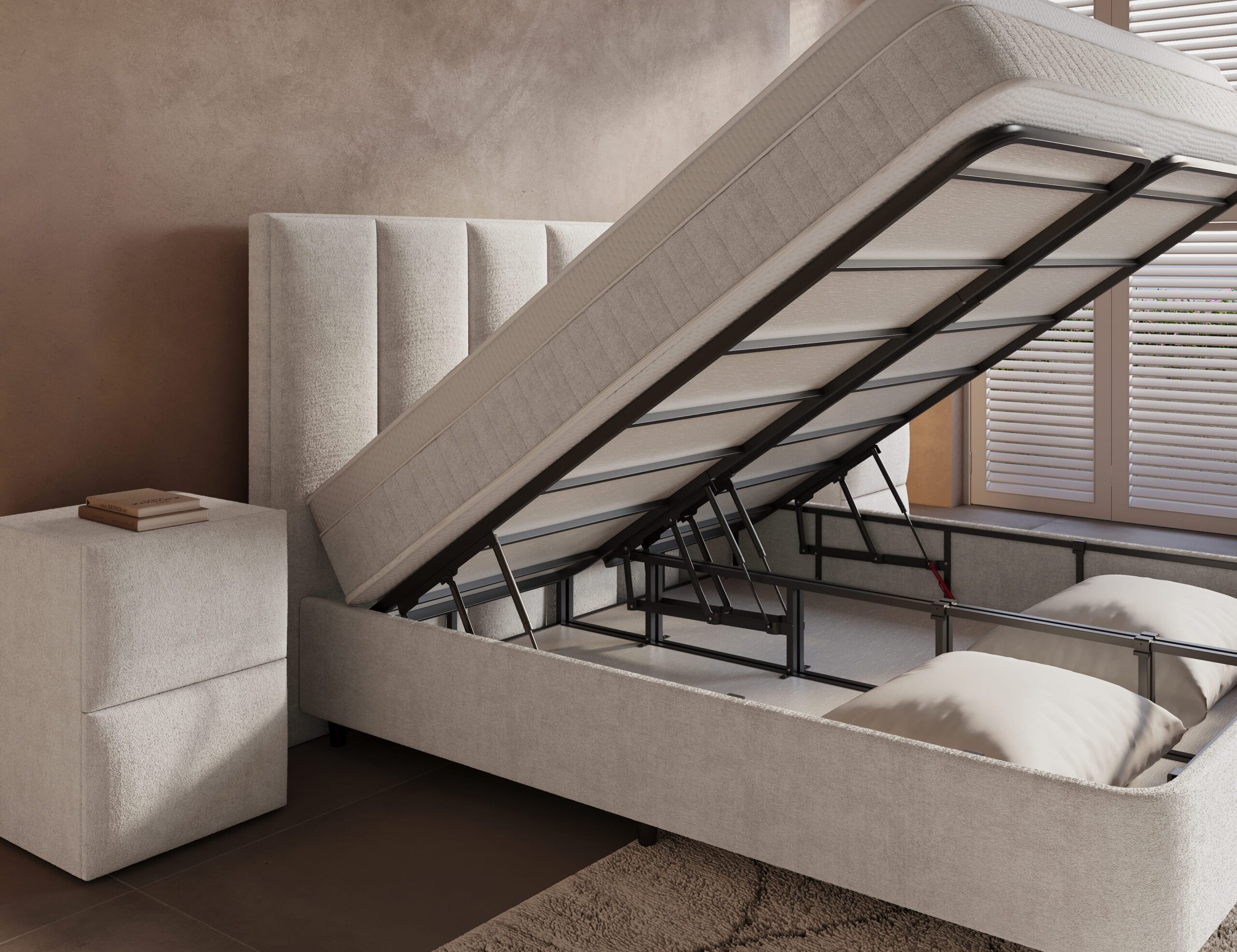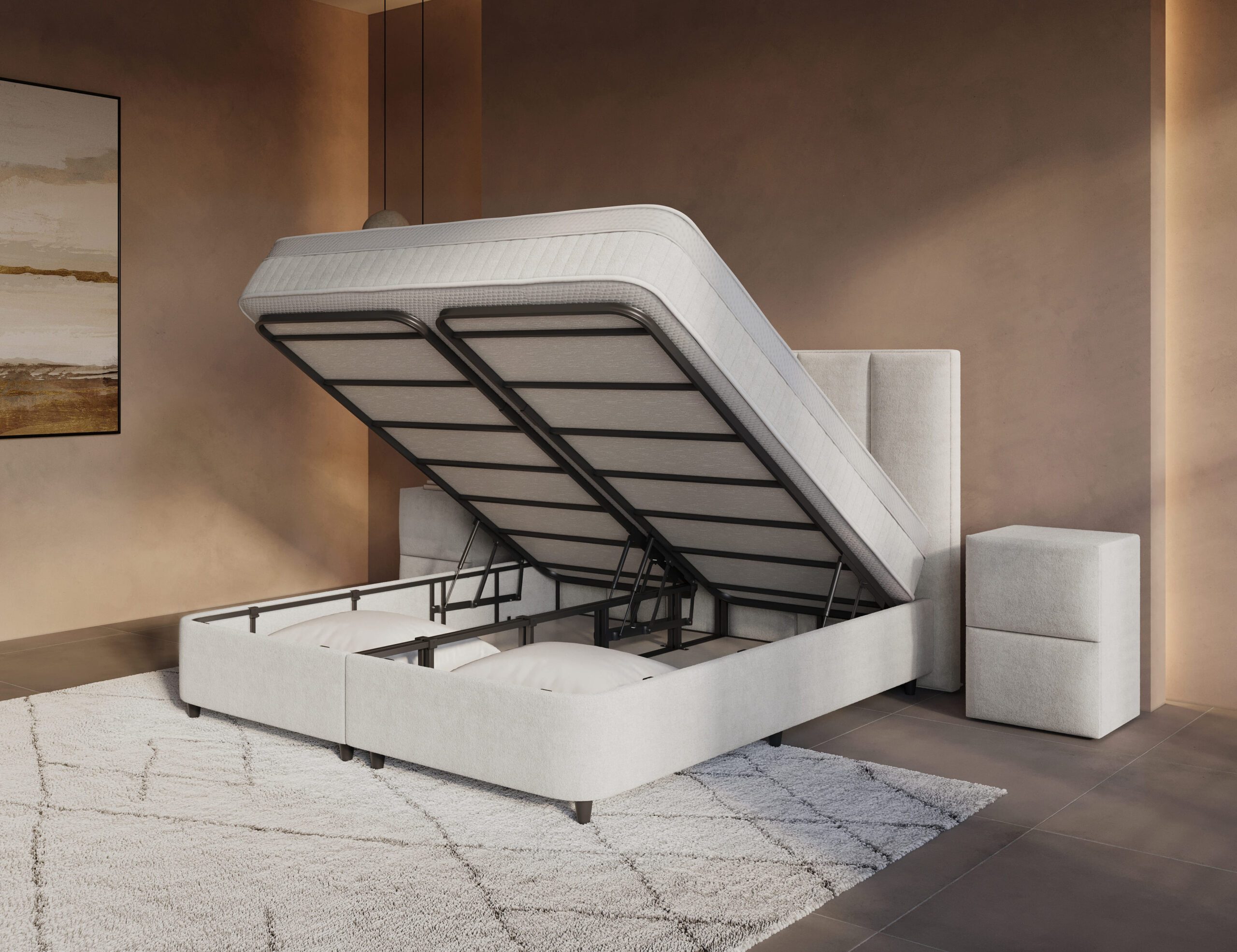 Onder de boxspring bevindt zich een ruime opbergruimte over de volledige lengte. Deze is via de voorkant te openen dankzij een degelijk metalen frame, gelegeerd met carbon en uitgerust met vier krachtige gasveren van 1.000 newton. De binnenzijde is afgewerkt met gefineerd plaatmateriaal, en het systeem is voorzien van beveiliging én stevige handgrepen aan box en matras.
