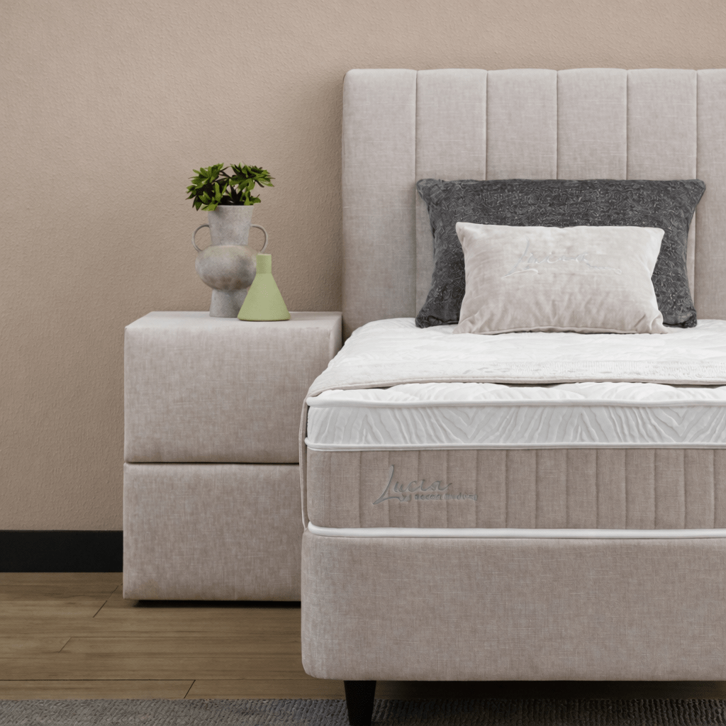 Het slapen op de Lucia is een ervaring op zich, dankzij het meegeleverde luxe matras van circa 30 cm dik. De kern is voorzien van een geavanceerde 7-zone pocketvering met 300 veren per m², waardoor het matras zich nauwkeurig aanpast aan uw lichaamsvorm. Dit biedt een uitstekende ondersteuning aan de rug en gewrichten. De afdeklaag van comfortschuim zorgt bovendien voor een zacht en uitnodigend liggevoel, waardoor u elke ochtend uitgerust en verfrist wakker wordt.