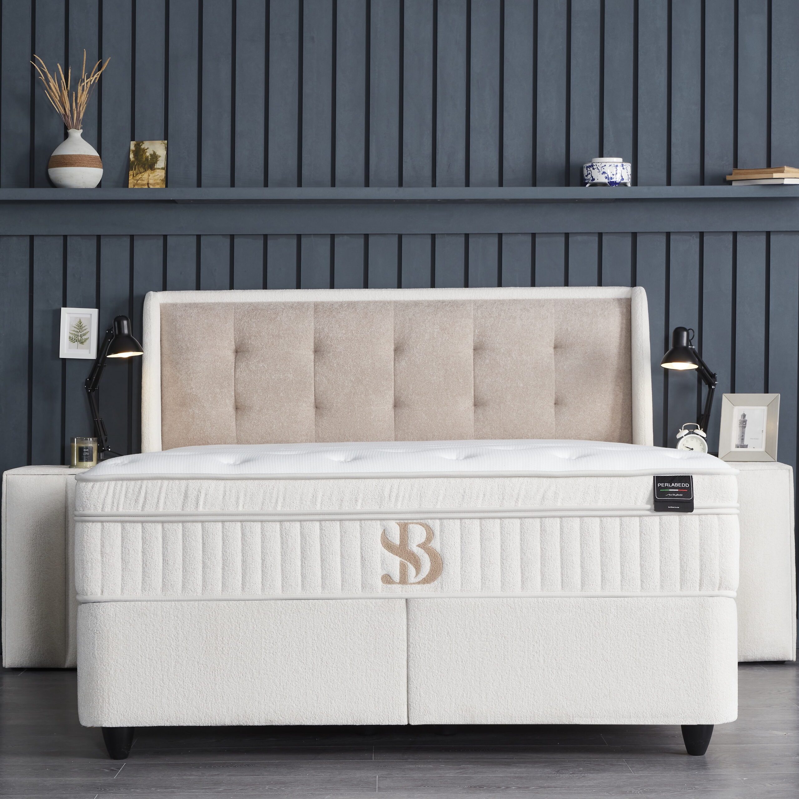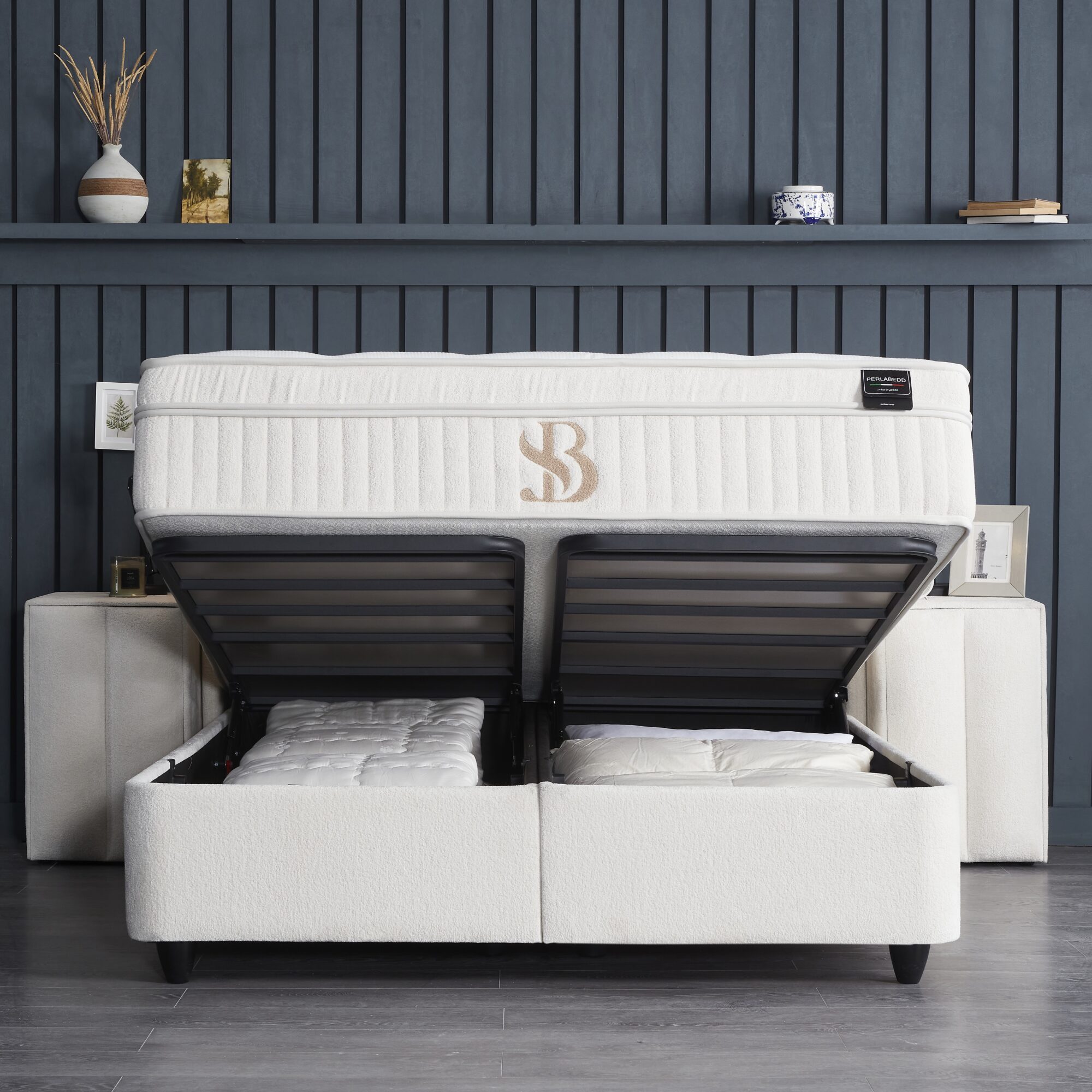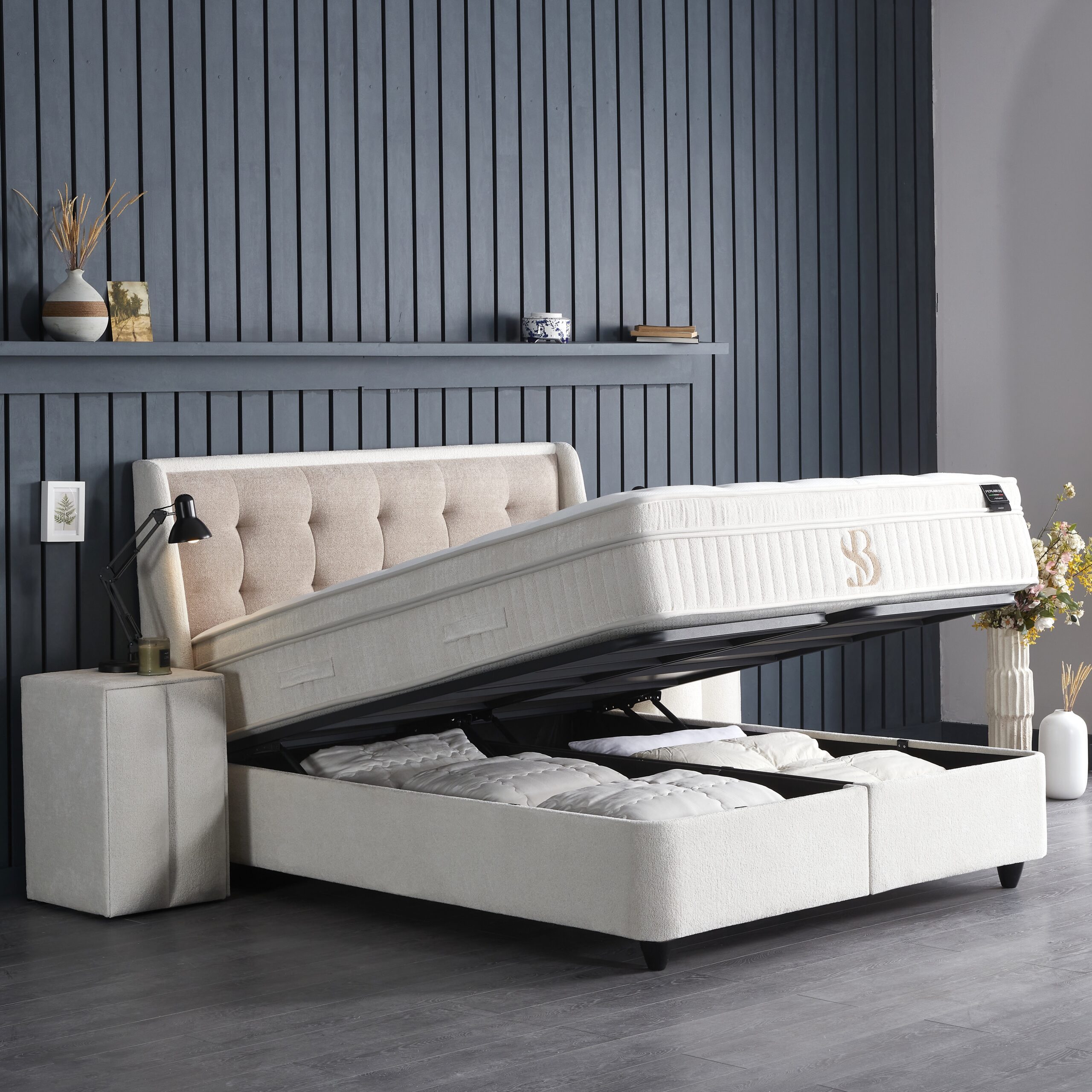 De Skybedd Perlabedd is een stijlvolle boxspring die rust en verfijning uitstraalt. Dankzij het Japandi-geïnspireerde gecapitonneerde hoofdbord en de luxe bouclé bekleding biedt dit bed een serene uitstraling, perfect voor moderne en minimalistische interieurs. Naast het elegante design profiteer je ook van een verrassend royale opbergruimte, ideaal voor wie comfort en functionaliteit wil combineren.
