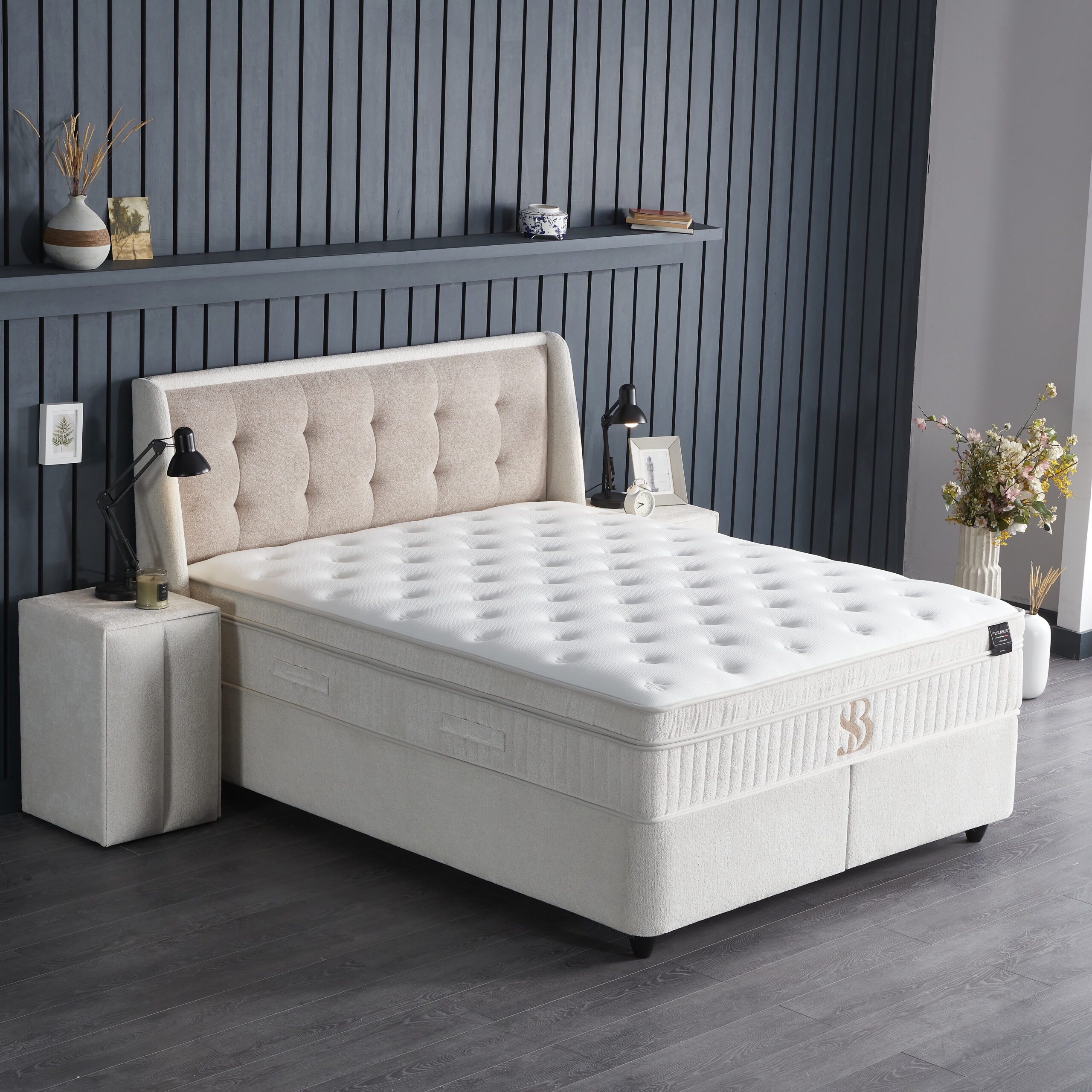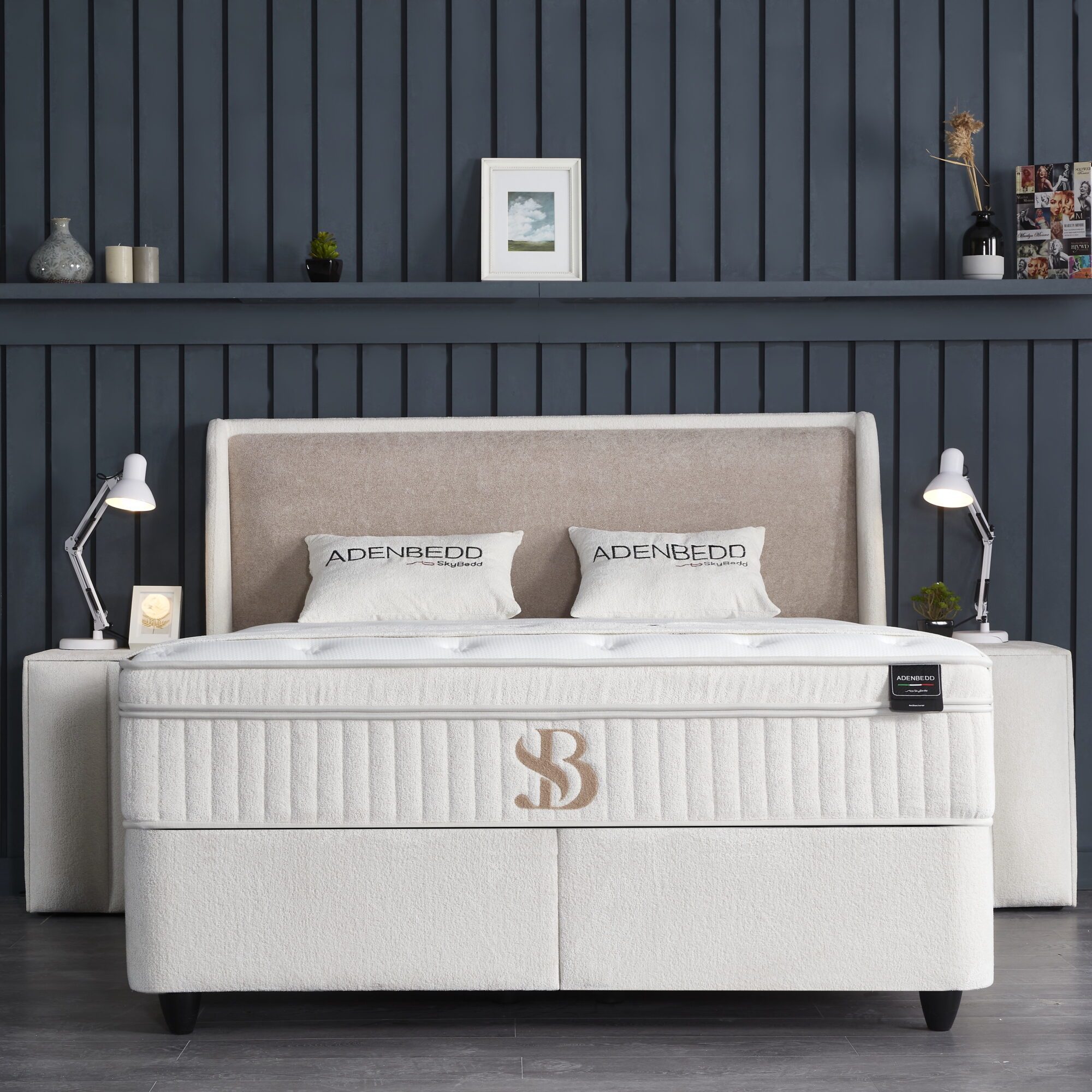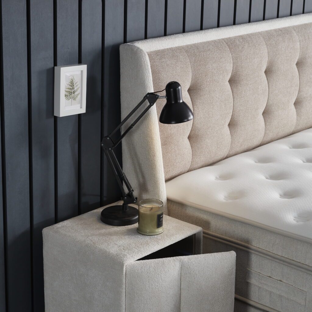 De Skybedd Perlabedd is een stijlvolle boxspring die rust en verfijning uitstraalt. Dankzij het Japandi-geïnspireerde gecapitonneerde hoofdbord en de luxe bouclé bekleding biedt dit bed een serene uitstraling, perfect voor moderne en minimalistische interieurs. Naast het elegante design profiteer je ook van een verrassend royale opbergruimte, ideaal voor wie comfort en functionaliteit wil combineren.