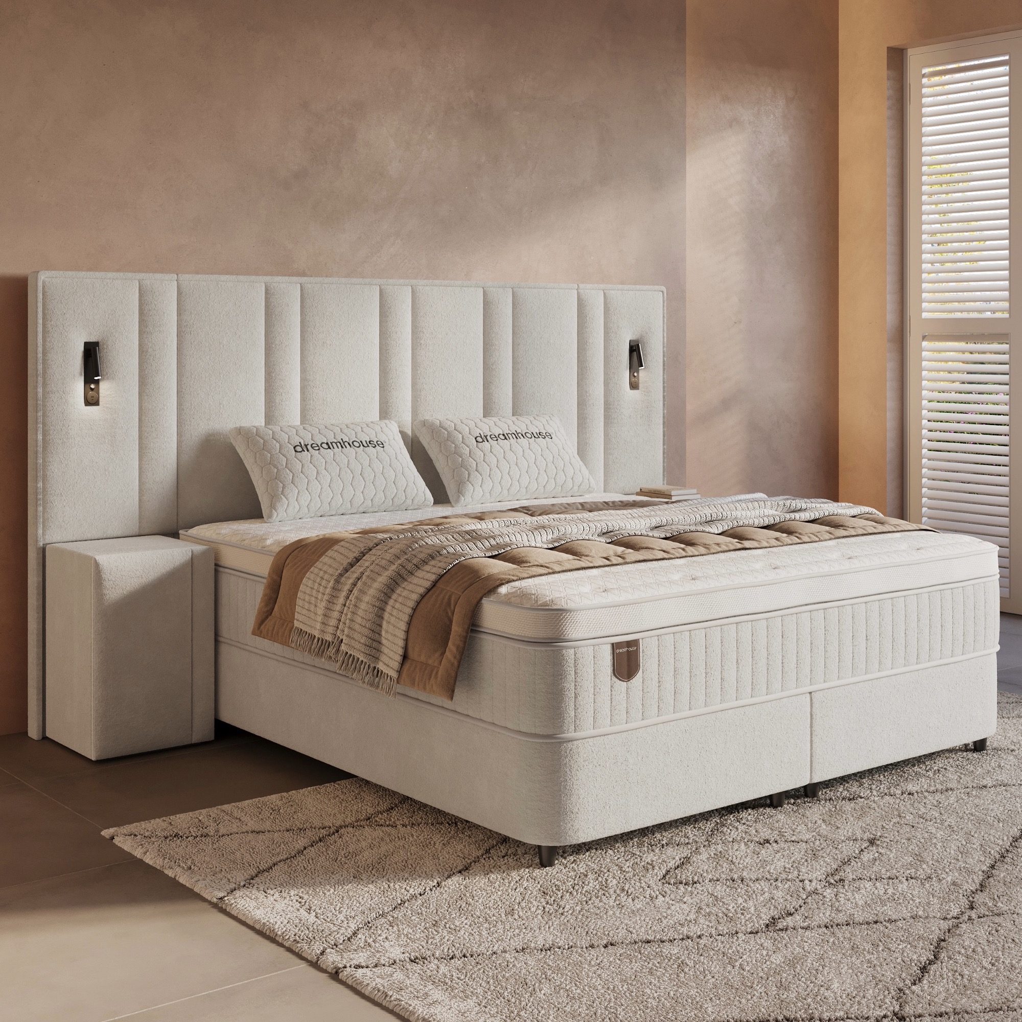 De Dreamhouse Royal XL is ontworpen voor wie houdt van klassieke luxe en royaal comfort. Deze statige boxspring combineert een indrukwekkend hoog hoofdbord met moderne gemakken zoals een geïntegreerde opbergruimte en een vaste koudschuim-topper. De warme beige bouclé-achtige symphony stof geeft het geheel een serene, tijdloze uitstraling — ideaal voor de luxe slaapkamer.