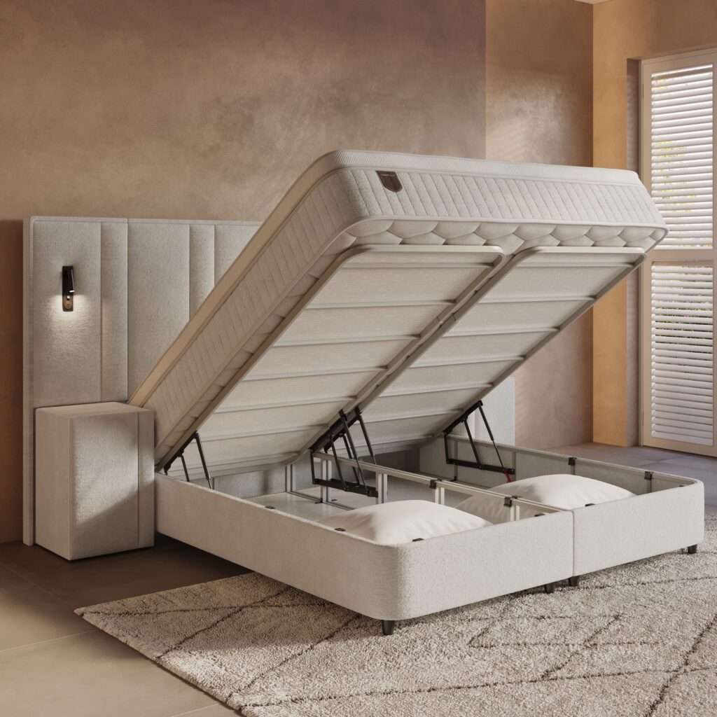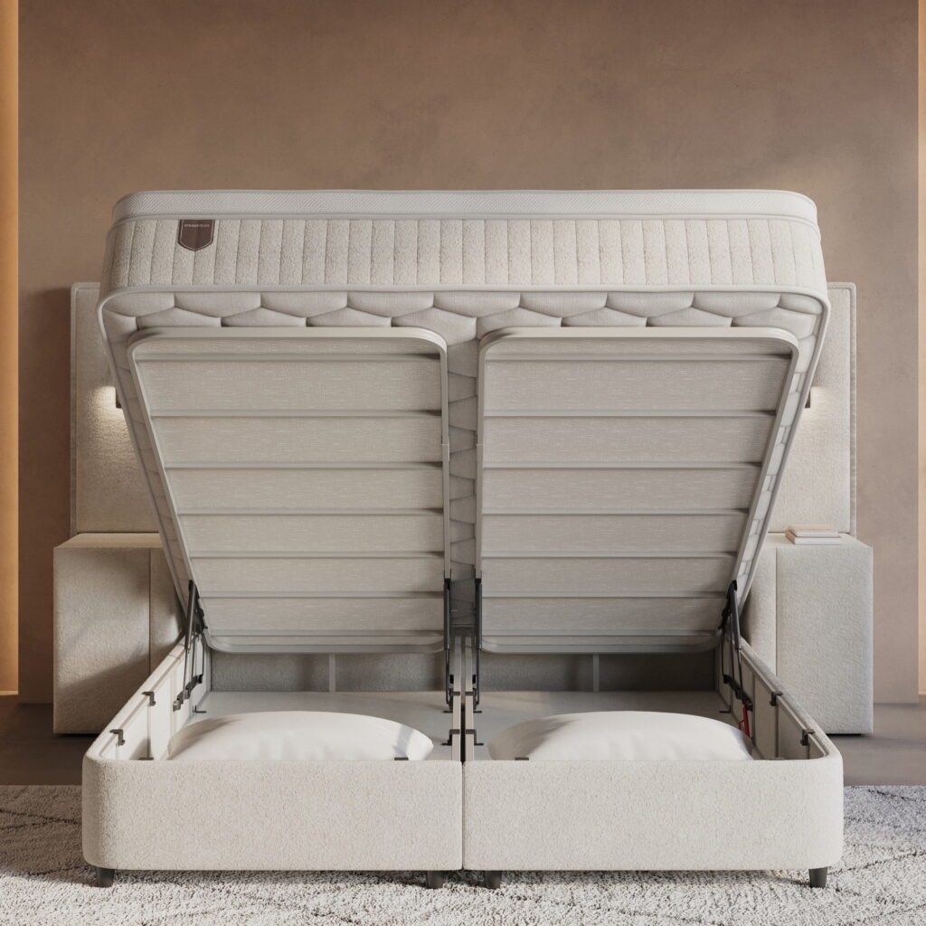 Onder de onderboxen bevindt zich een royale opbergruimte van 200 cm lang, toegankelijk via de voorzijde. Dankzij vier voorgemonteerde gasveren van 1000 newton til je de deksel moeiteloos op. De binnenzijde bestaat uit een carbon-gelegeerd metalen frame en een deksel van gefineerd plaatmateriaal. Handvaten aan beide zijden maken het openen extra praktisch. Ideaal voor het opbergen van beddengoed, kussens of seizoensartikelen.