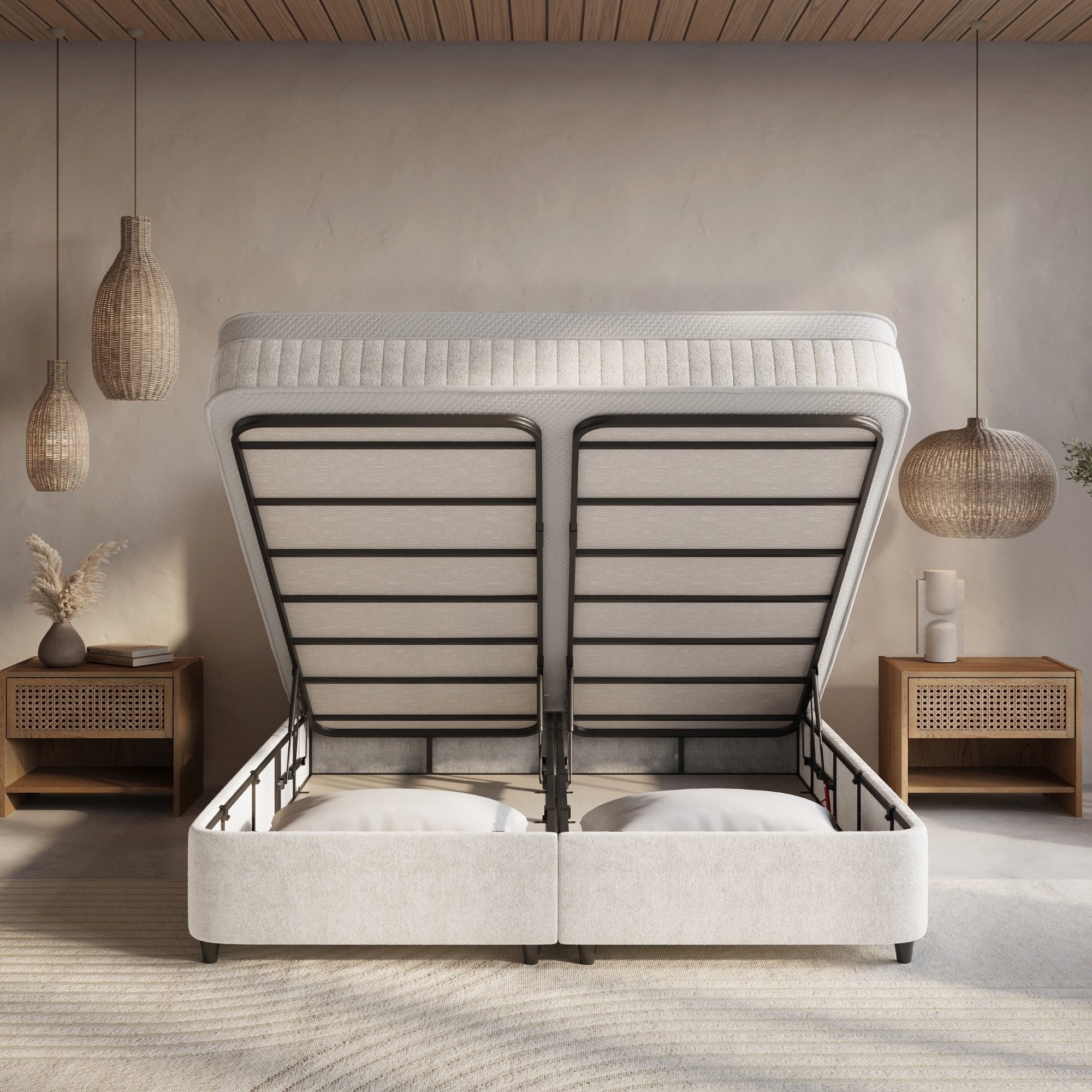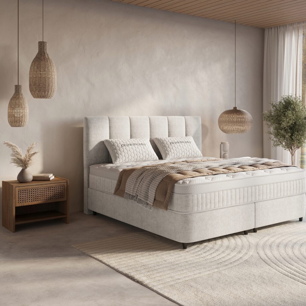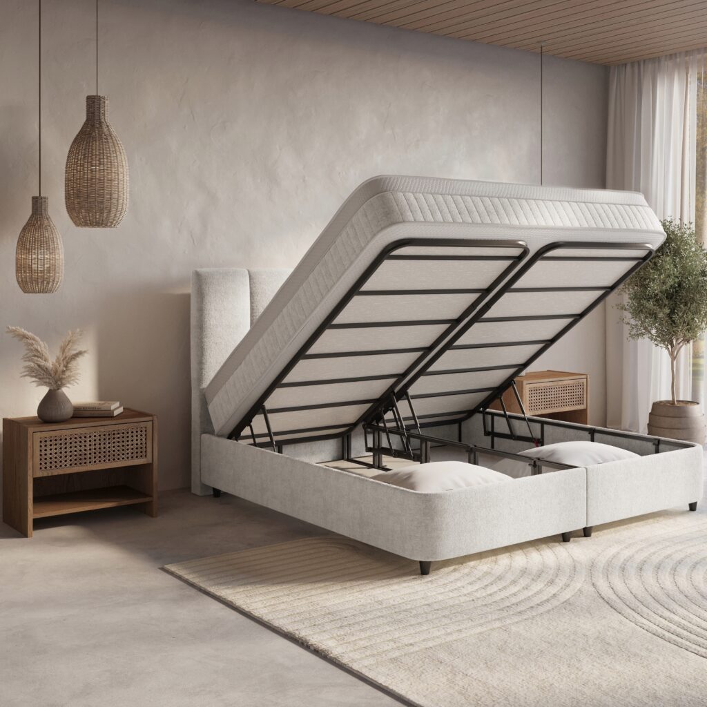 De Sierra Beige is een krachtige verschijning in de slaapkamer. Met zijn diepe antracietkleurige Nano-stof en strakke Japandi-hoofdbord ademt deze opbergboxspring moderne luxe en rust. Tegelijkertijd biedt het slimme opbergsysteem onder het bed maximale functionaliteit – perfect voor wie stijlvol én praktisch wil slapen.