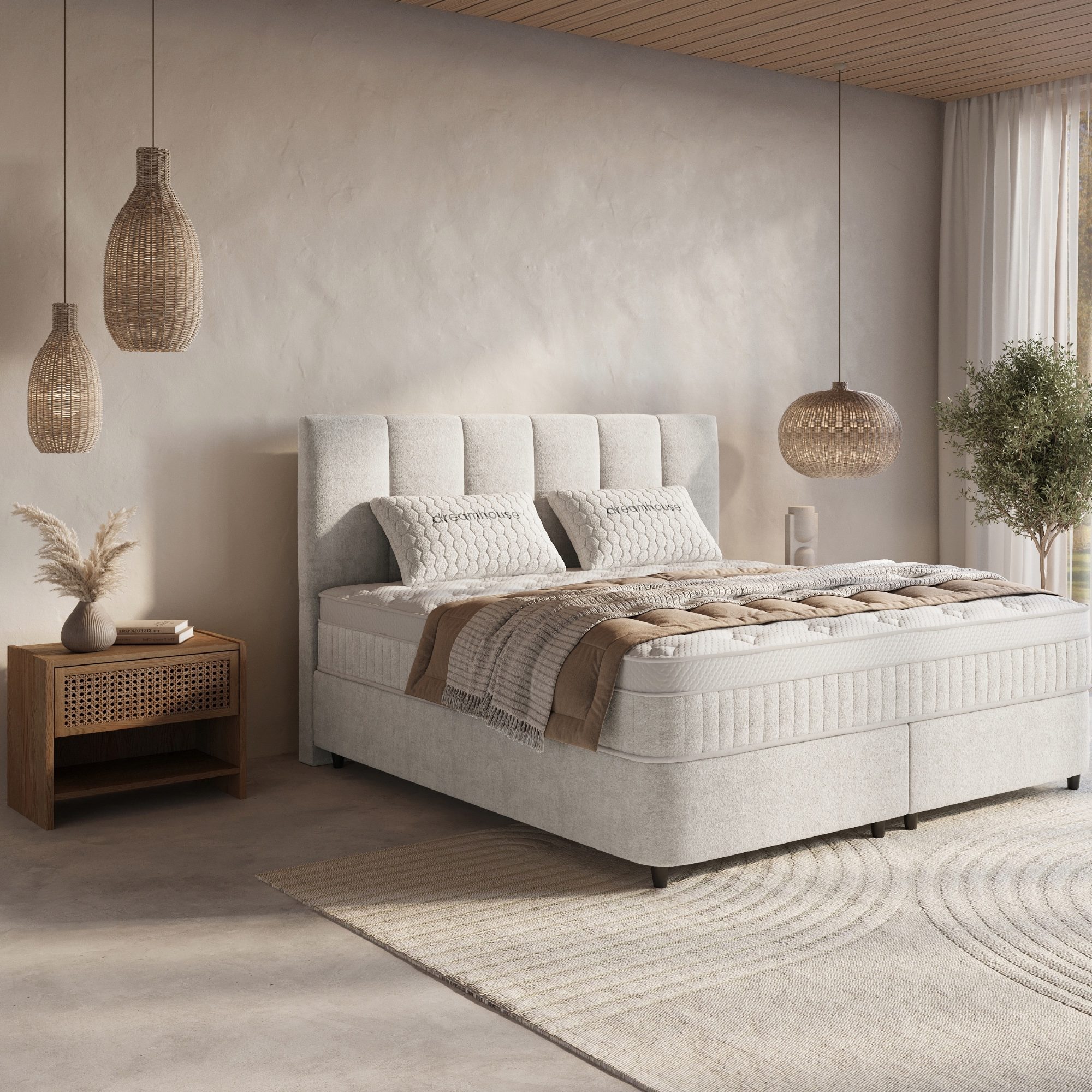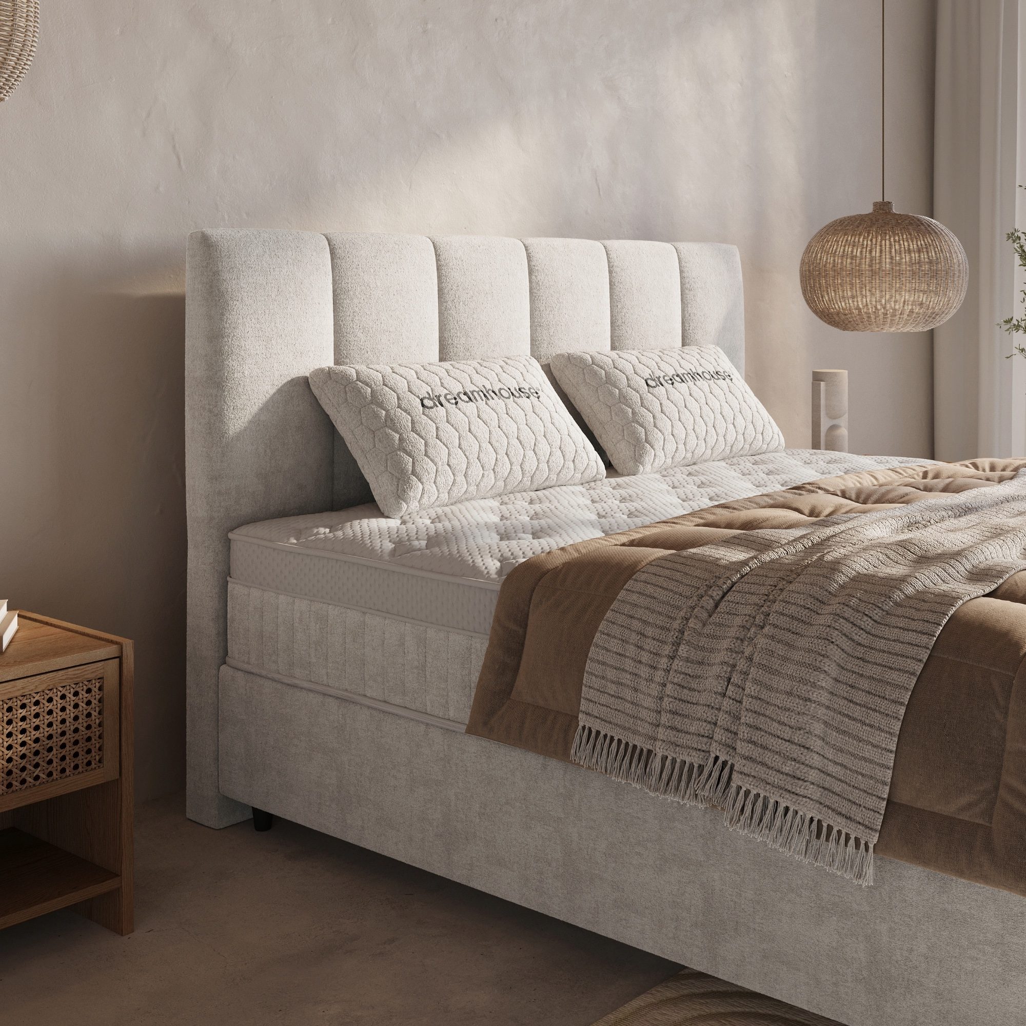De Sierra Beige wordt geleverd als compleet slaapconcept, inclusief pocketveringmatras en ingebouwde topper. Het matras heeft 7 ergonomische comfortzones en is opgebouwd uit een kern van 13 cm pocketvering, met aan beide zijden 5 cm HR50 koudschuim. Het ligcomfort is medium tot stevig – geschikt voor zij-, rug- én buikslapers. De ingebouwde topper van 6 cm verhoogt het comfort en zorgt voor een stabiele ligging dankzij antislip en matrasremmers.