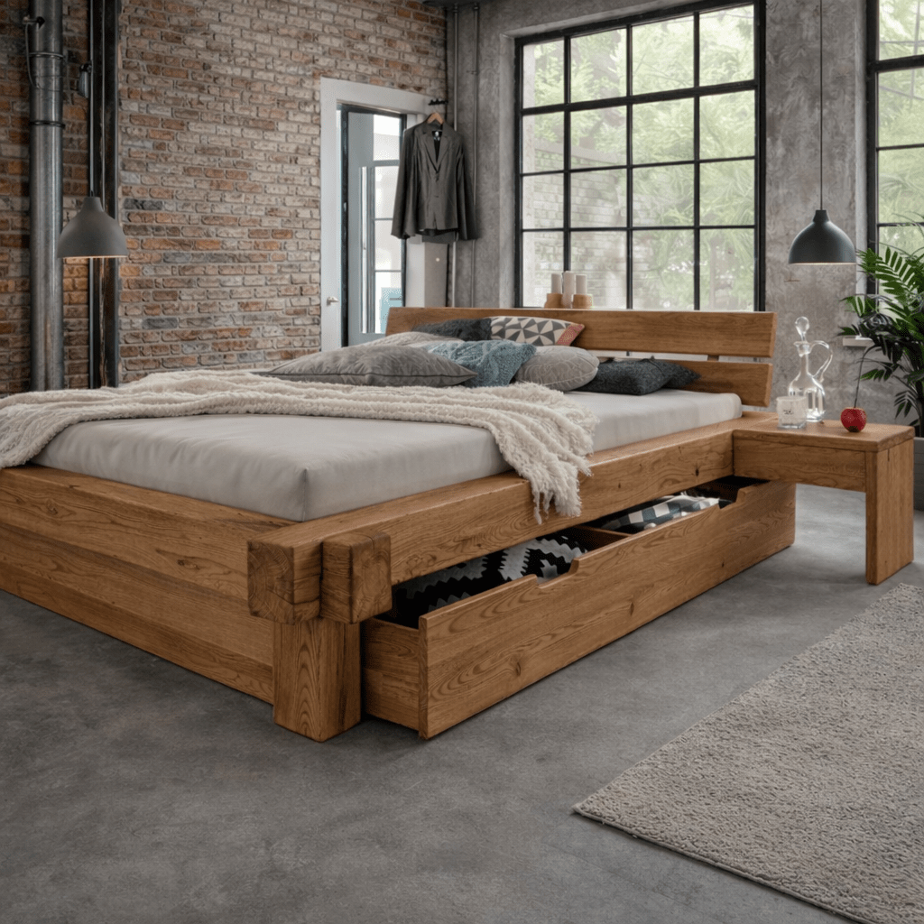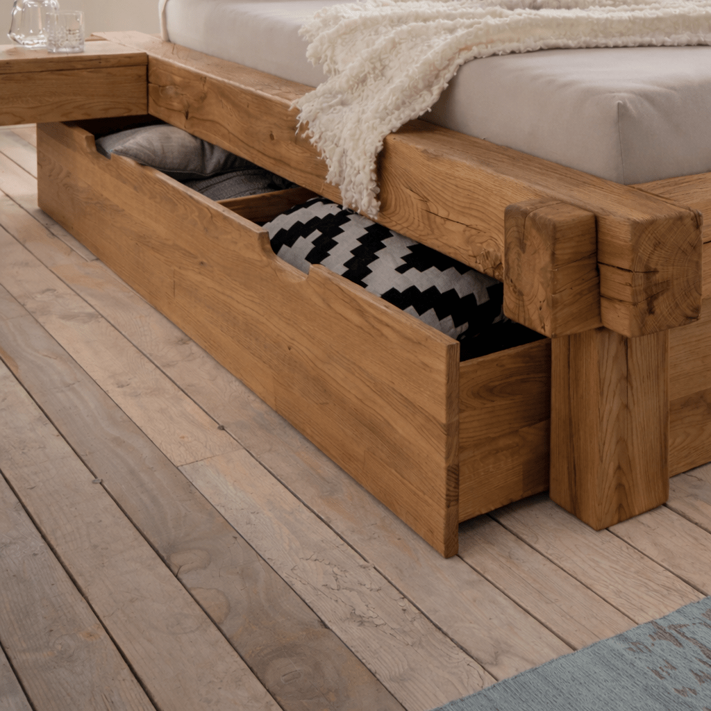 Daarnaast biedt de massief eikenhouten onderbouw veel praktische opbergruimte. Let op: bij een bedbreedte van 140 cm is er maximaal één lade mogelijk. Vanaf een breedte van 160 cm kunnen er echter twee laden worden gemonteerd. De lade is voorzien van een stevige scheidingswand van 20 mm dik. Kortom, u bergt uw spullen altijd netjes en stofvrij op.