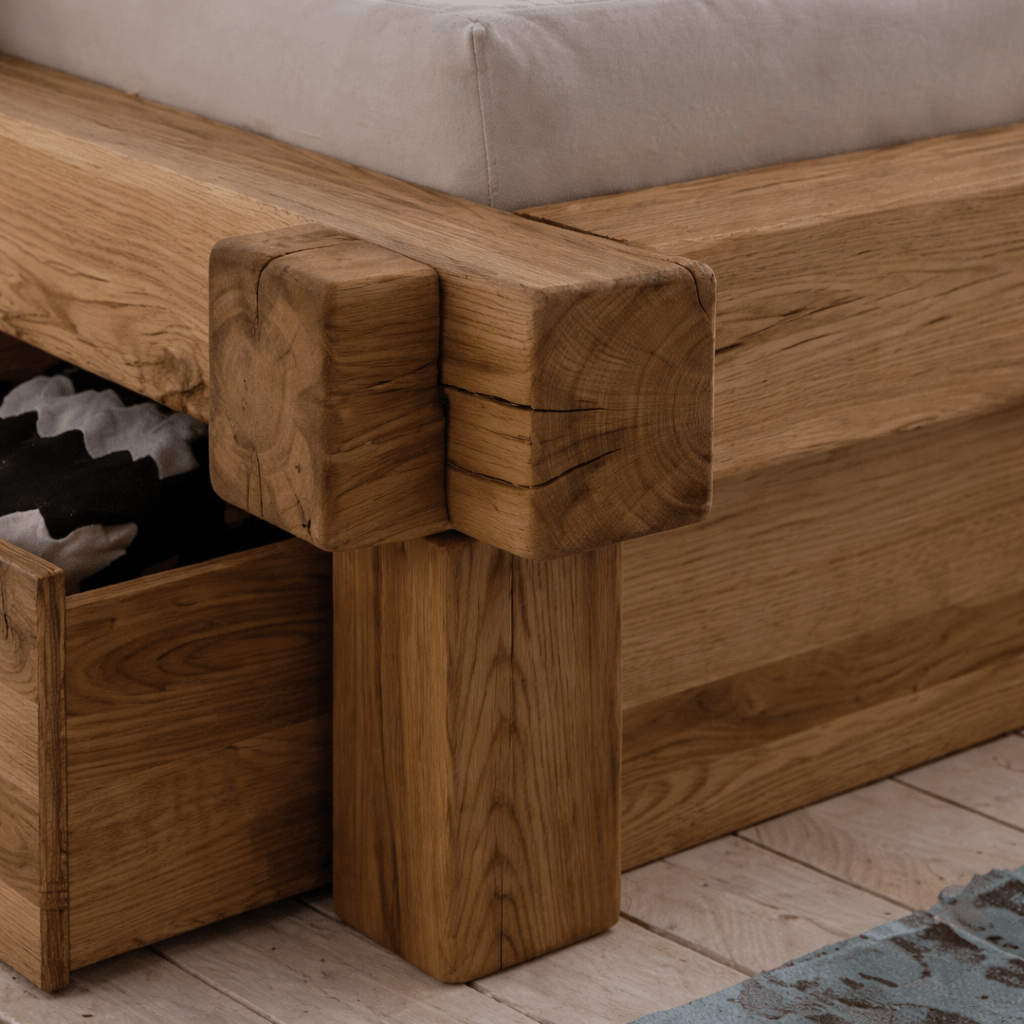 De WOODSTOCK-serie met opberglades kenmerkt zich door een grote functionaliteit. Dit model is specifiek geconstrueerd met het robuuste hoofdbord ‘Balk 2’. Verder rust het frame op zware houten poten van 12 x 12 cm. Hierdoor bedraagt de totale hoogte van het bed 86 cm. Het bedframe zelf heeft een balkdoorsnede van 12 cm breed en 15 cm diep.