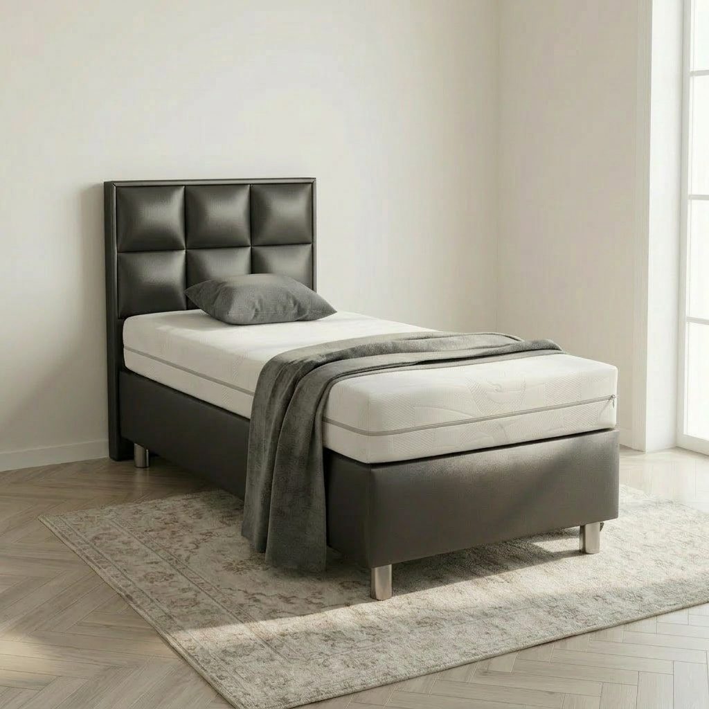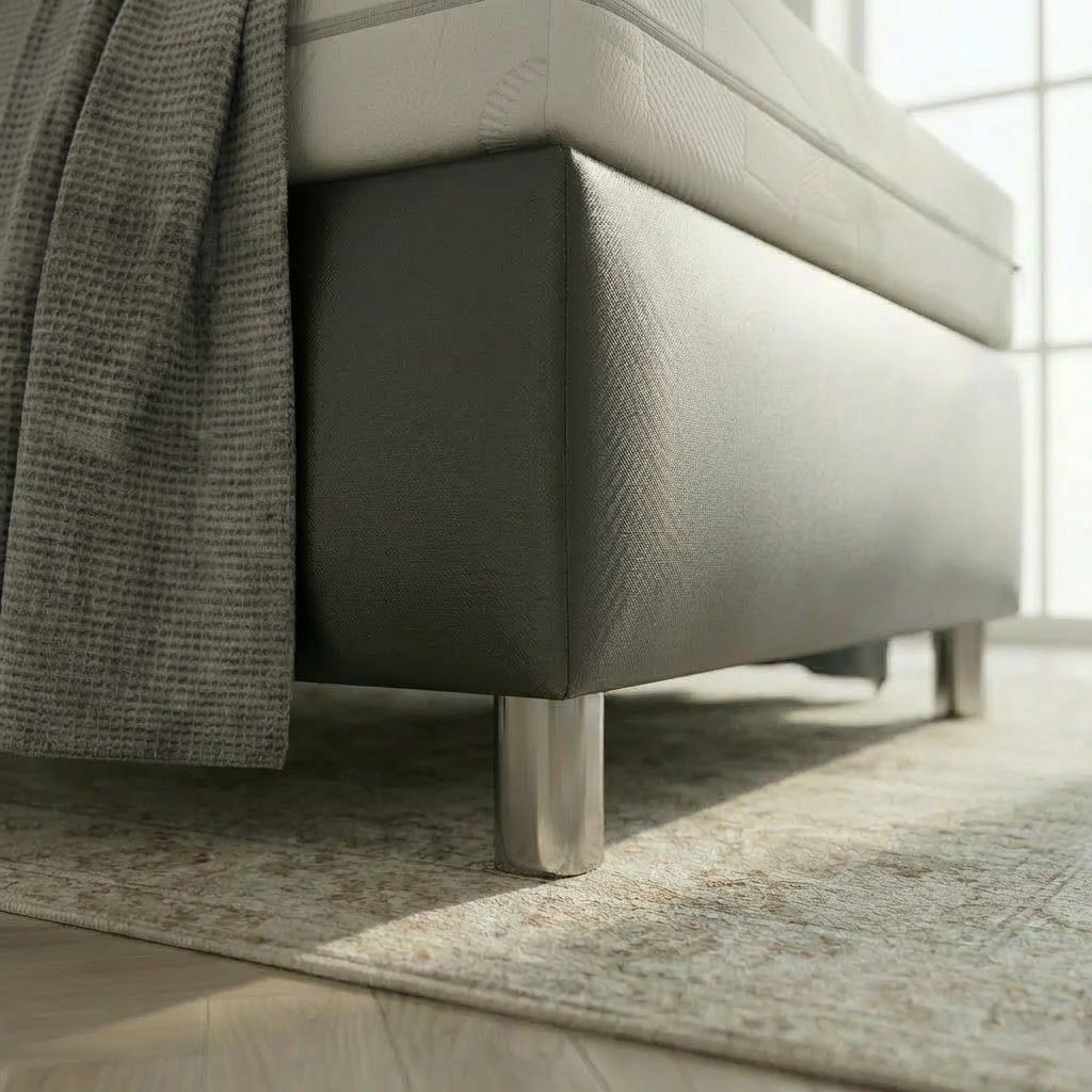 Deze luxe 1-persoons boxspring wordt standaard geleverd met een stevige hotel box van maar liefst 30 cm dik. Met een draagkracht tot 160 kg per persoon biedt deze box uitstekende ondersteuning en langdurig comfort. De boxspring staat op stijlvolle 12 cm hoge chromen poten, wat zorgt voor een ideale instaphoogte en een moderne uitstraling.