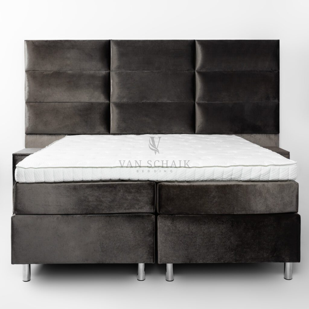 Ervaar het summum van comfort, design en afwerking met de Boxspring Platinum Deluxe van Van Schaik Bedding. Deze imposante verschijning is niet zomaar een bed, maar een statement in jouw slaapkamer. Met zijn royale hoofdbord van maar liefst 175 cm hoog en strak gestoffeerde afwerking straalt de Platinum Deluxe pure hotelklasse uit – tot in de finesse. Een perfecte match voor wie kiest voor chique luxe, maatwerk en maximale rust.